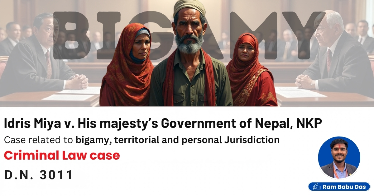 Idris Miyan, a married Muslim citizen of Nepal residing in Jhapa, went to India for work, where he married another woman, Bachha Miyani, in accordance with Indian law, and later returned to Nepal. He was then prosecuted on the charge of bigamy.